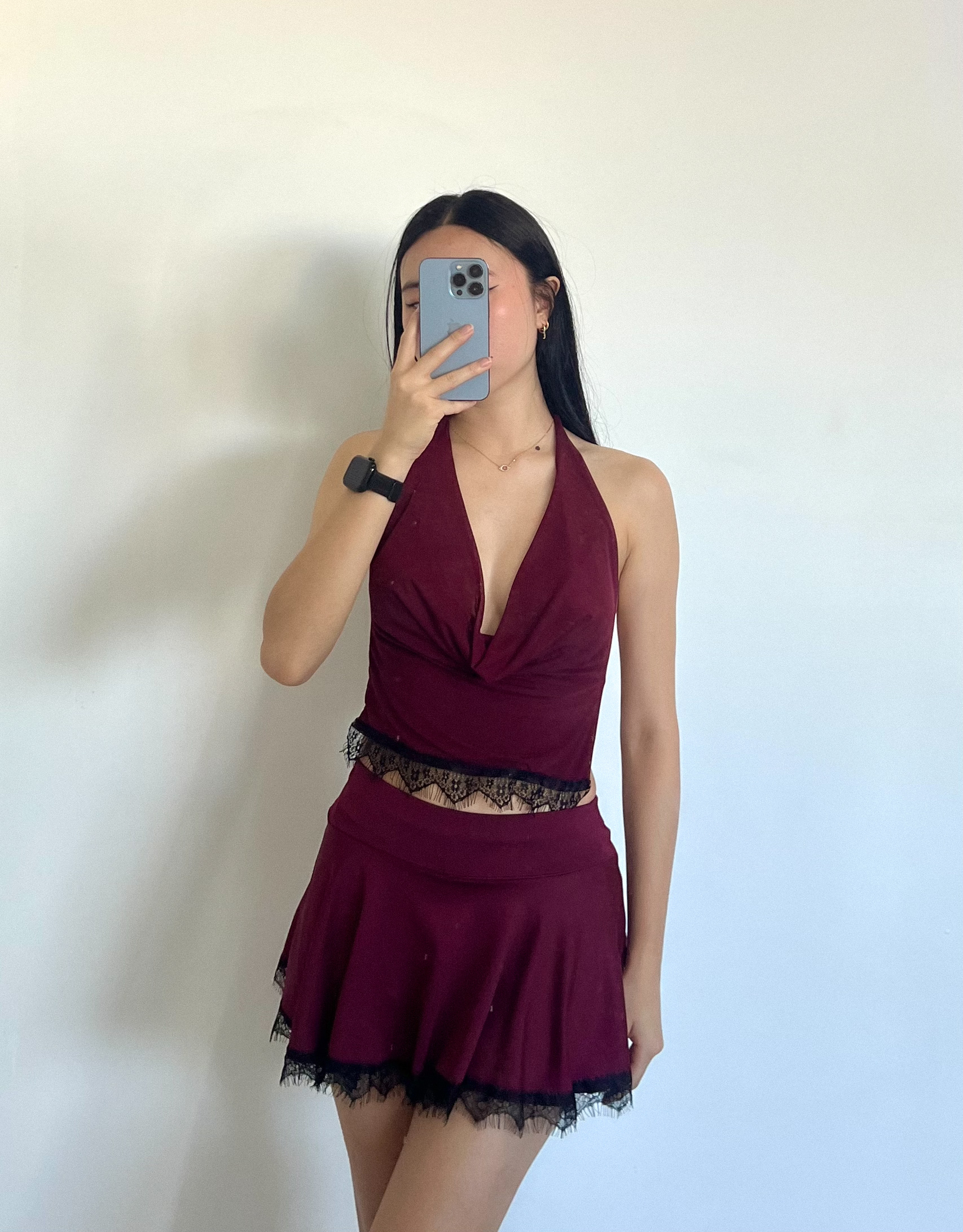 1228/T-TOP TUL LISO BUCHE CAIDO CON PUNTILLA FLECOS ABAJO Y TIRA PARA ATAR CUELLO Y ESPALDA - malbec MALBEC agotado $0