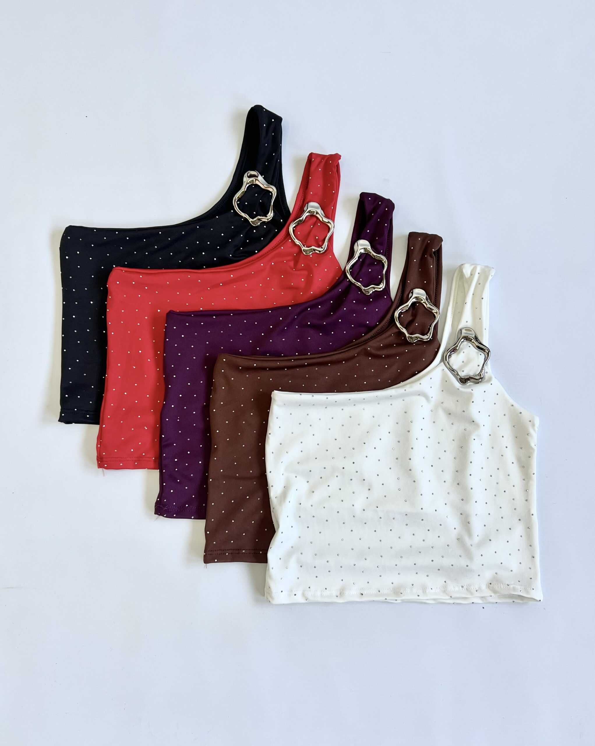 2107/MS-TOP MICROFIBRA BRILLO STRASS UN HOMBRO CON HEBILLA NUBE Y PECHERA FORRADO