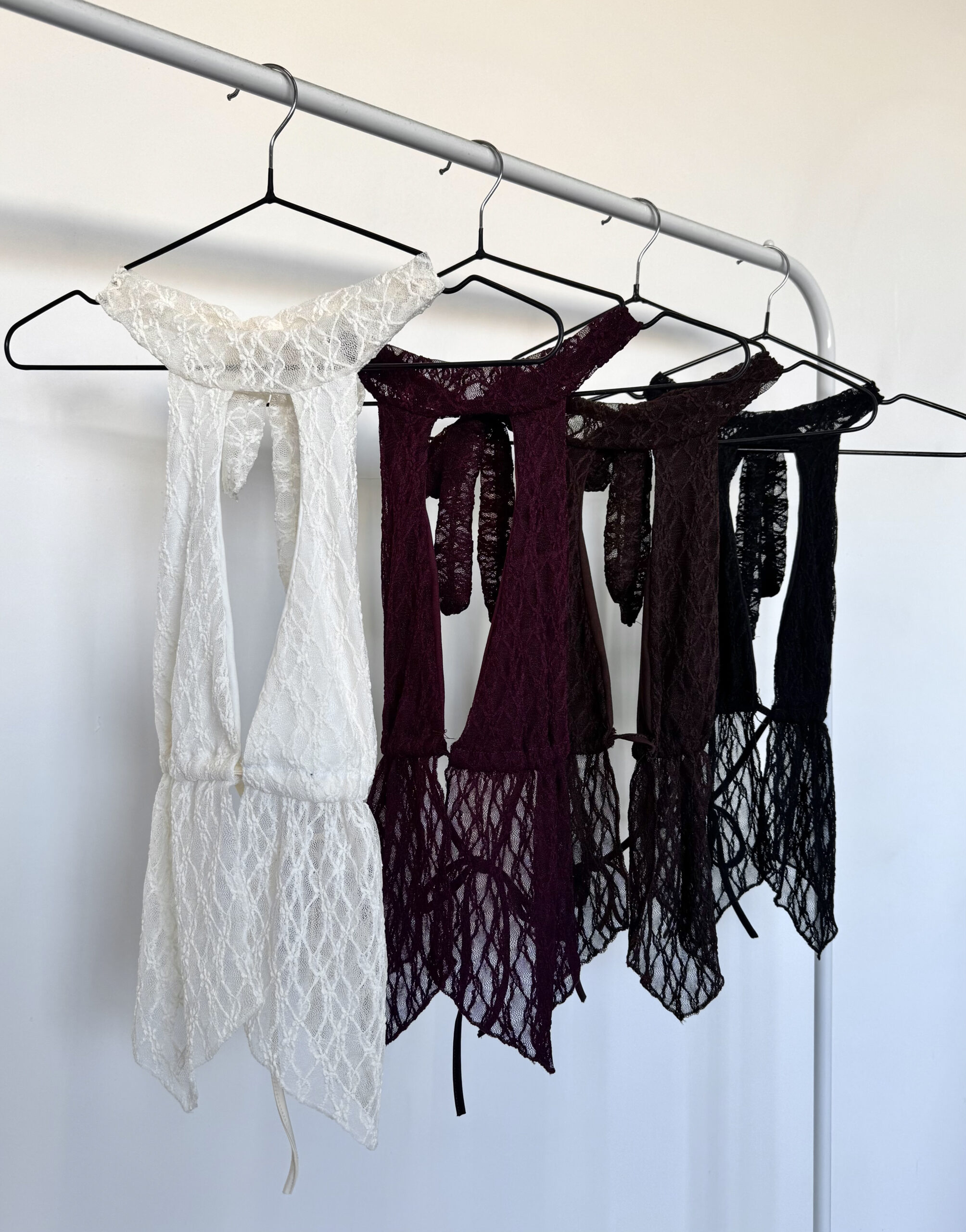 2577/E-TOP ENCAJE MONET CUELLO HALTER PARA ATAR CON PECHERRA FORRADO CORDON BAJO BUSTO Y VOLADO PICO