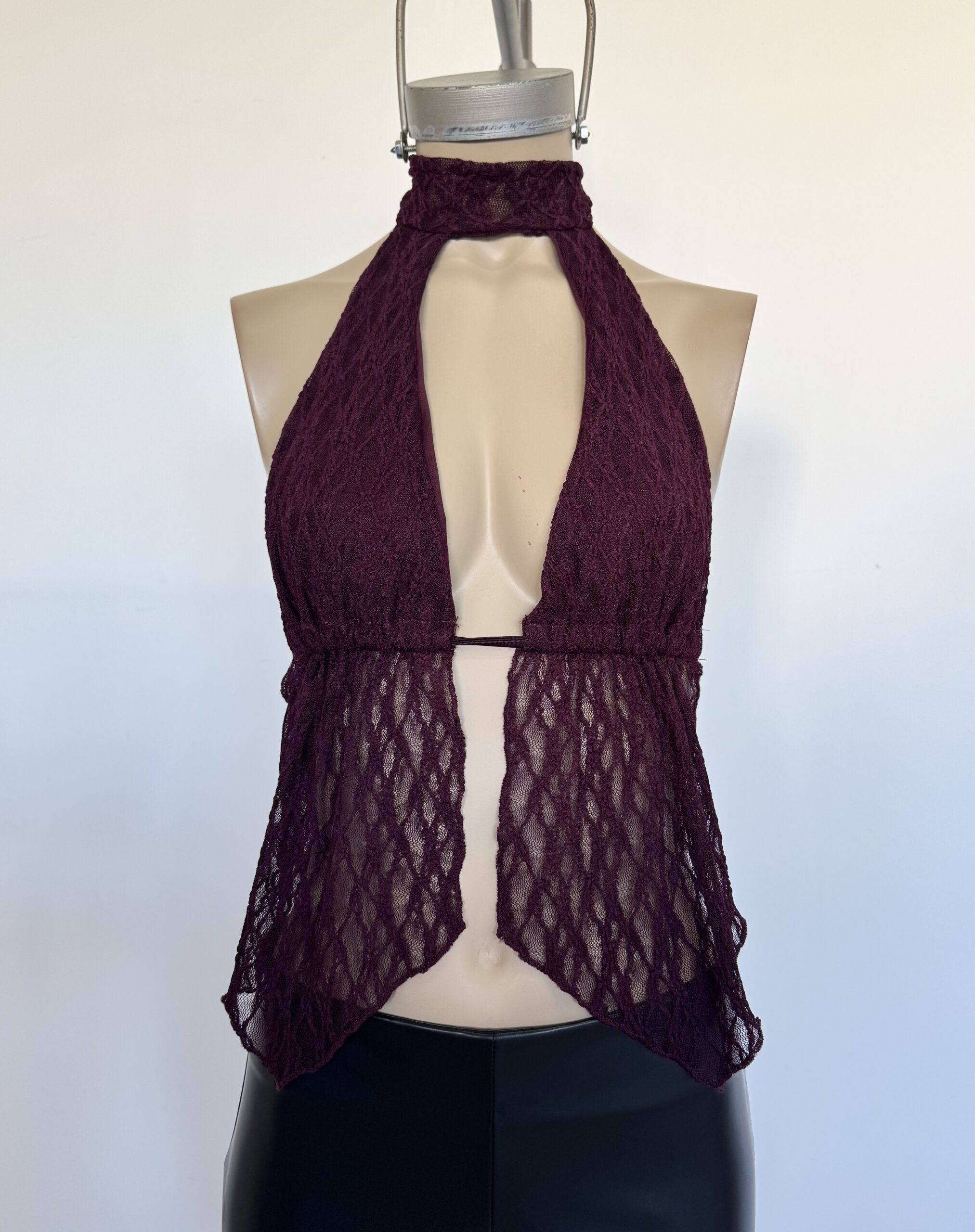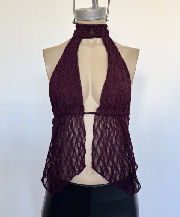 2577/E-TOP ENCAJE MONET CUELLO HALTER PARA ATAR CON PECHERRA FORRADO CORDON BAJO BUSTO Y VOLADO PICO - uva UVA en stock $0