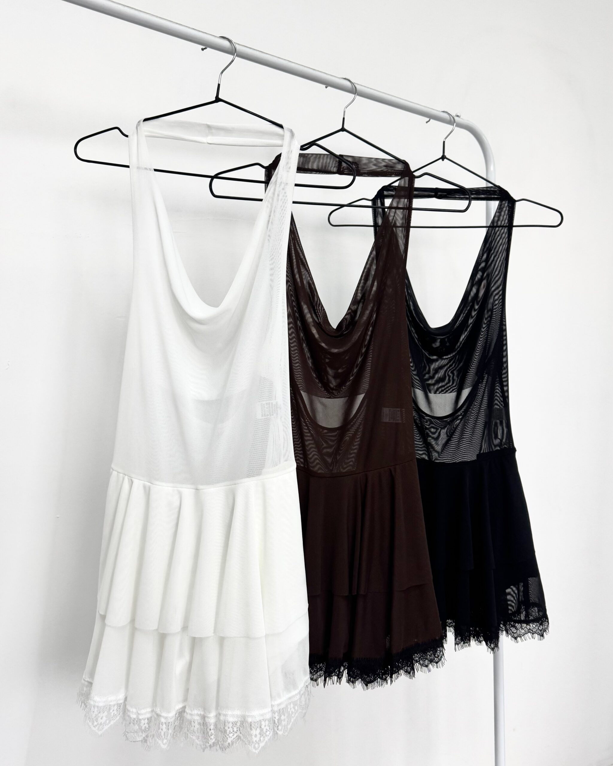 520/T-VESTIDO TUL LISO MARILYN BUCHE CAIDO CON DOBLE VOLADO PUNTILLA FLECOS Y SHORT INTERNO - choco CHOCO en stock $0