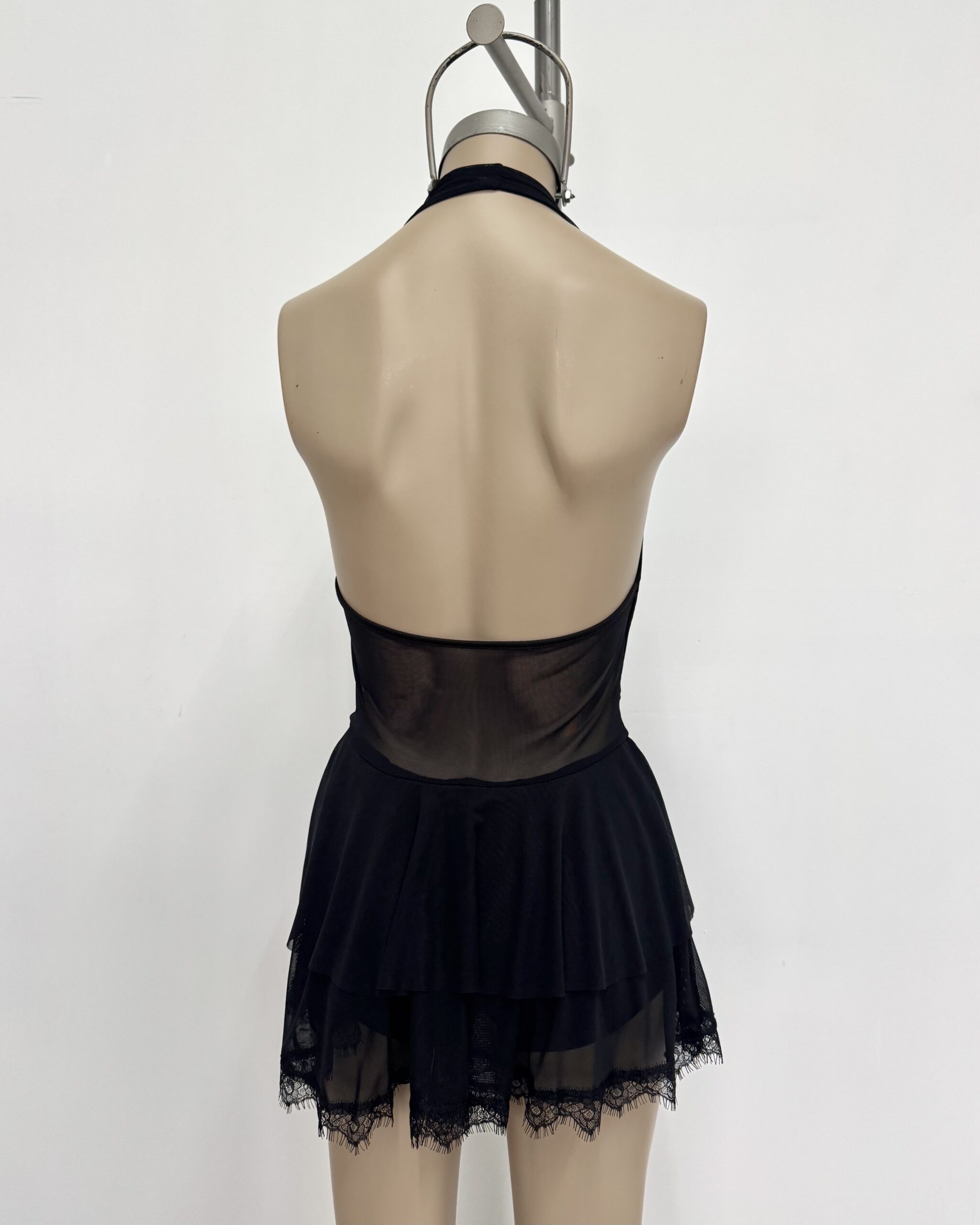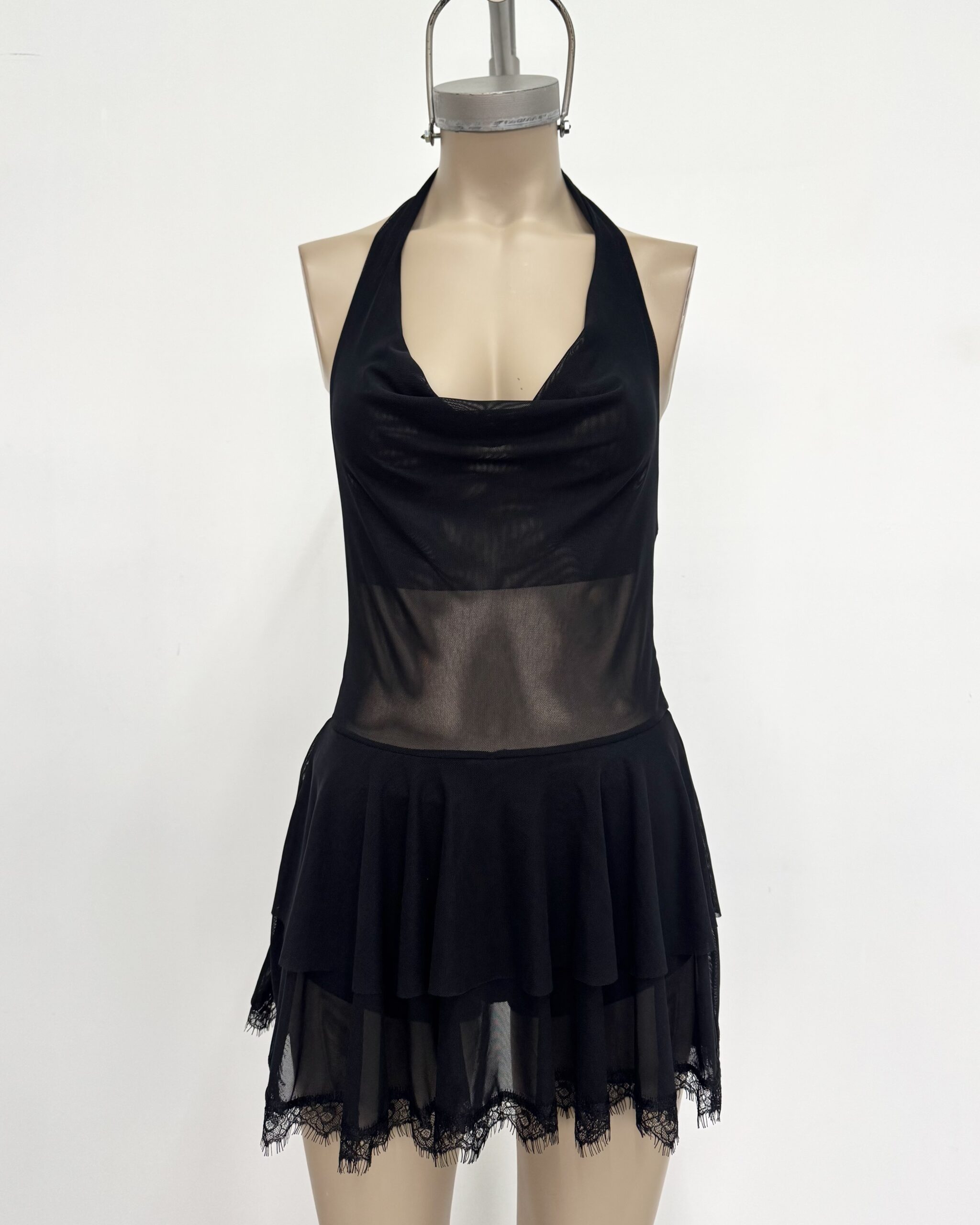 520/T-VESTIDO TUL LISO MARILYN BUCHE CAIDO CON DOBLE VOLADO PUNTILLA FLECOS Y SHORT INTERNO - negro NEGRO en stock $0