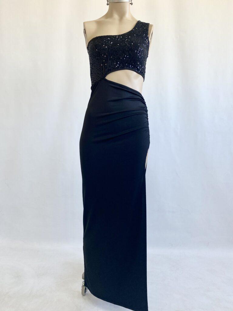 399/LE-VESTIDO LARGO LENTEJUELA COMBI MICRO UN HOMBRO ABERTURA FRUNCE ELASTICO