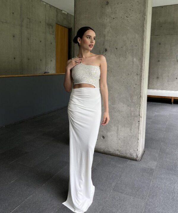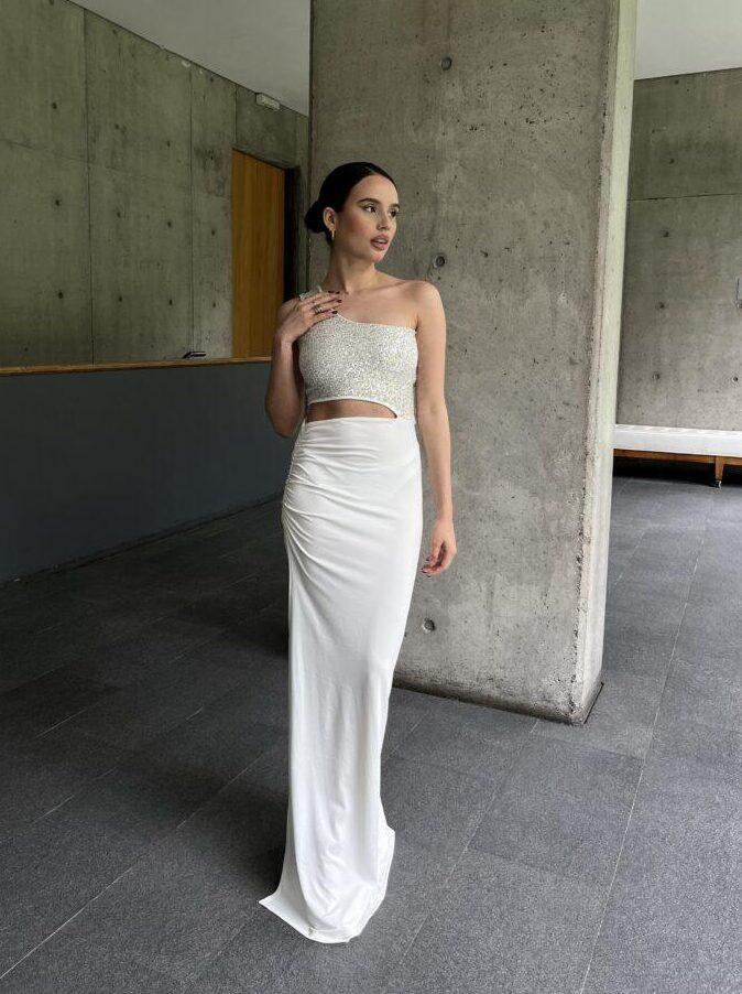 399/LE-VESTIDO LARGO LENTEJUELA COMBI MICRO UN HOMBRO ABERTURA FRUNCE ELASTICO - blanco BLANCO agotado $0