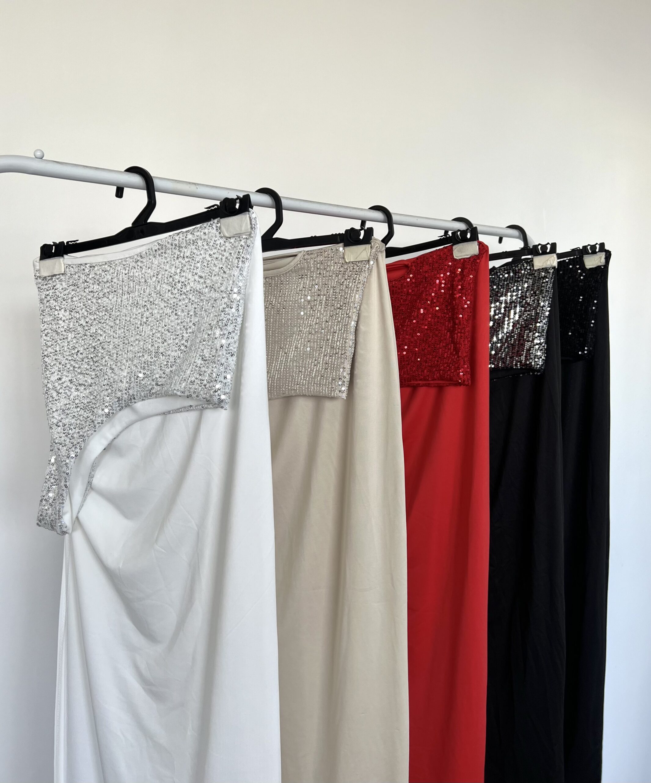 399/LE-VESTIDO LARGO LENTEJUELA COMBI MICRO UN HOMBRO ABERTURA FRUNCE ELASTICO - rojo ROJO agotado $0
